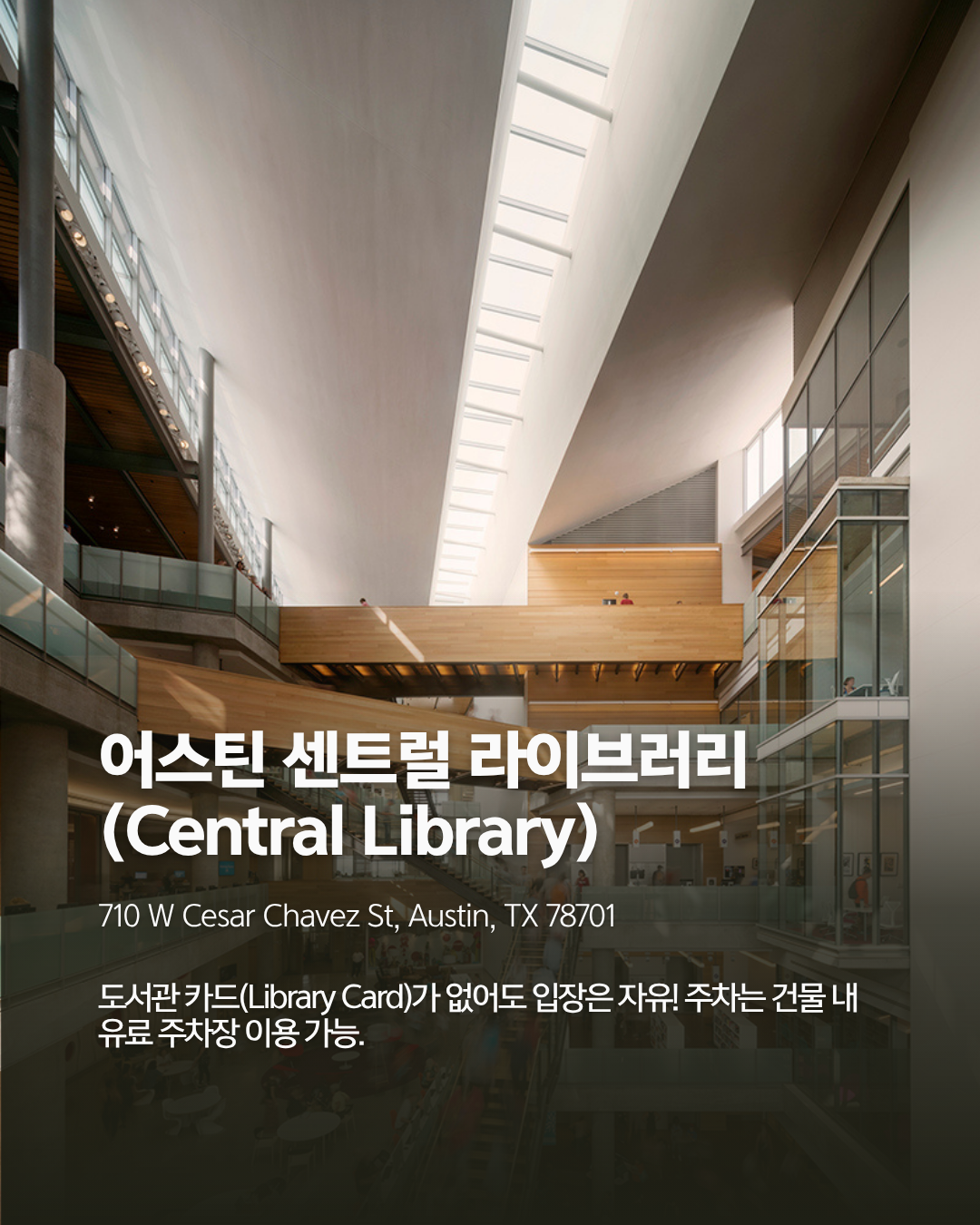 꿀팁: 도서관 카드(Library Card)가 없어도 입장은 자유! 주차는 건물 내 유료 주차장 이용 가능.