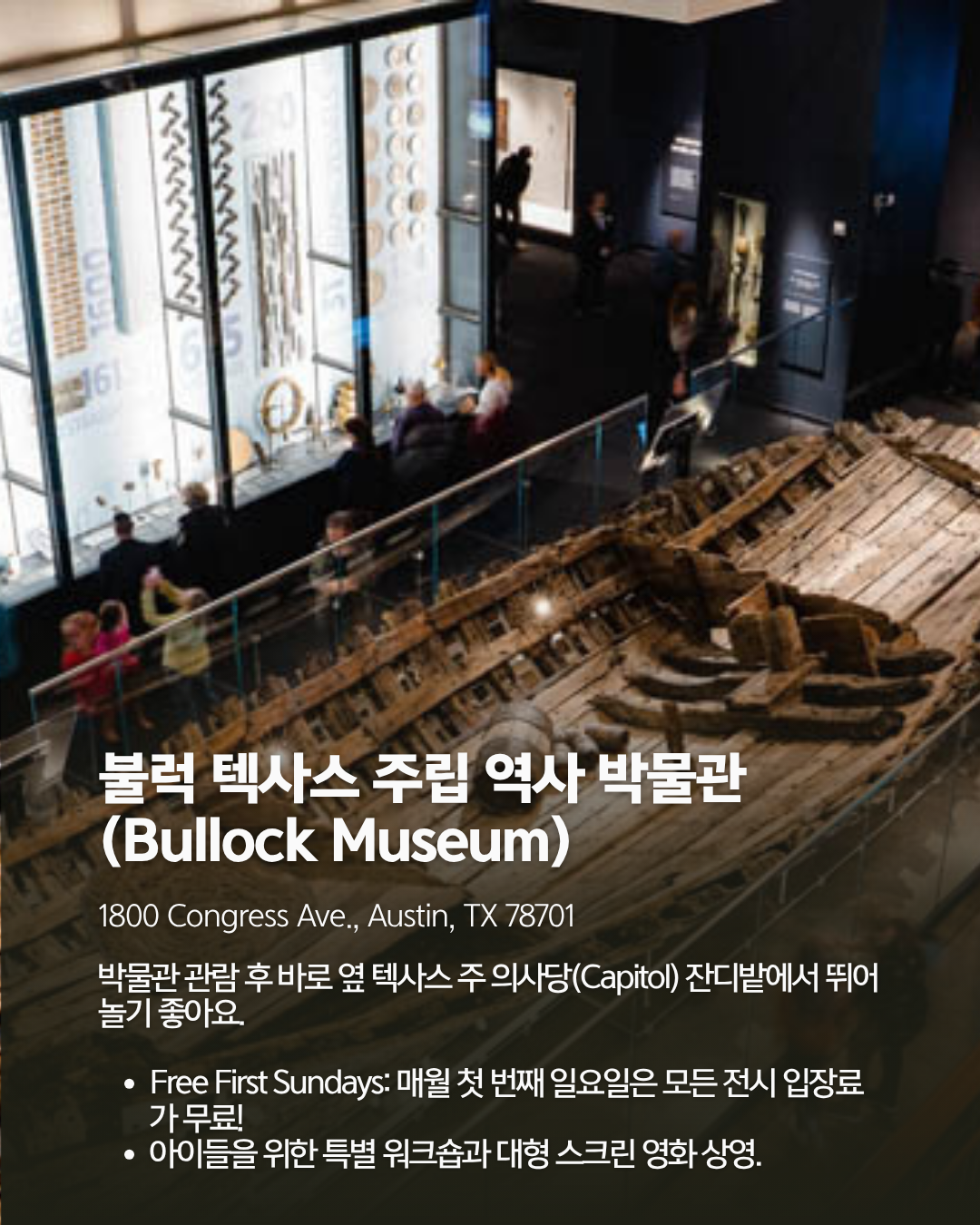 꿀팁: 박물관 관람 후 바로 옆 텍사스 주 의사당(Capitol) 잔디밭에서 뛰어놀기 좋아요.